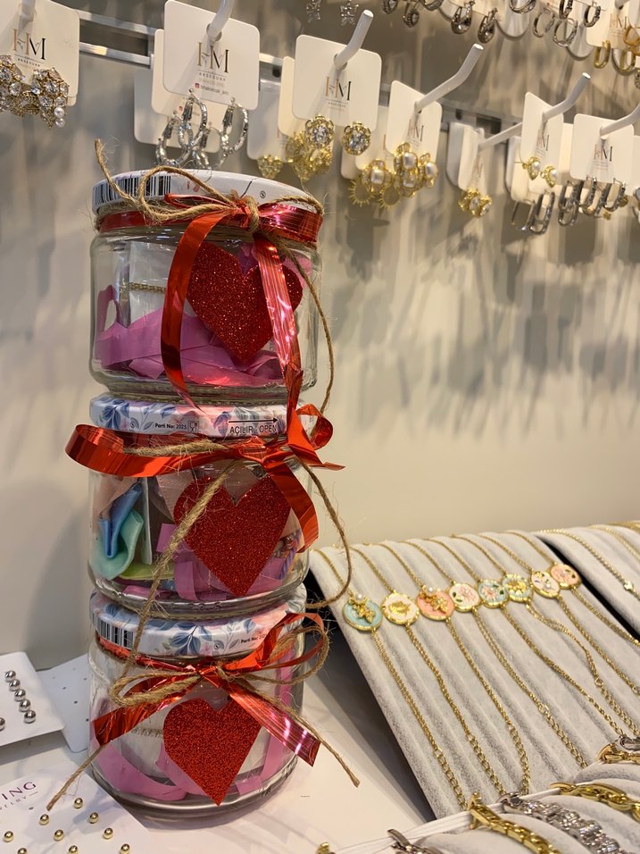Small boy Takı kavanozu tamamı yeni ürün ✨✨ Renkli katlanmış notlar içeren, kırmızı kurdele ve simli kalp süslemeleriyle dekore edilmiş üst üste dizilmiş cam kavanozlar. He