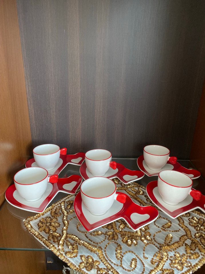 Altı adet beyaz kahve fincanı, kırmızı kulplu ve kalp şeklinde kırmızı tabaklar üzerinde, beyaz kalp detayıyla sunulur. ☕️