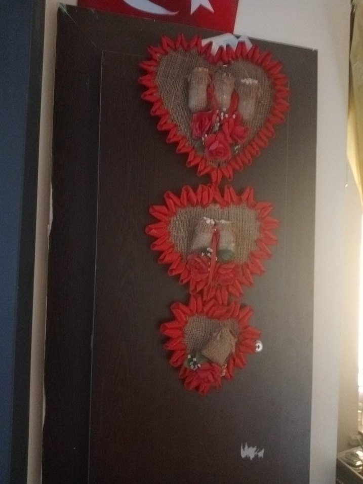 Üç kalp şeklinde kırmızı çiçeklerle süslenmiş duvar dekoru, mekana şık bir dokunuş katar.