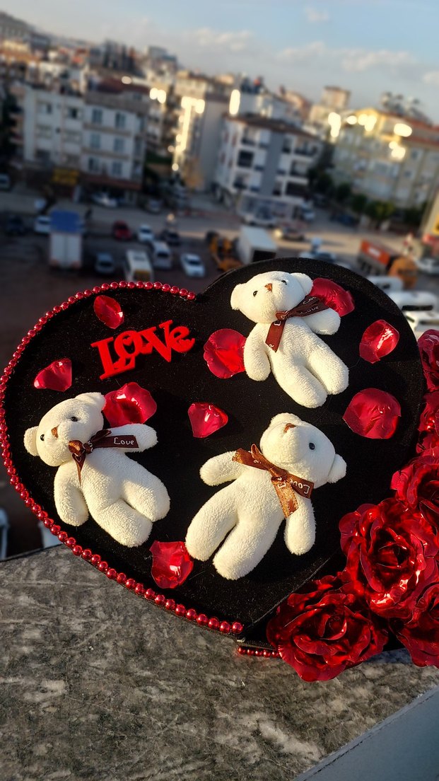 Kırmızı gül yaprakları ve "LOVE" yazısı ile süslenmiş koyu renk kalp şeklinde tabanda 3 beyaz peluş ayı yer alıyor. Kenarı kırmızı boncuklarla çevrilidir. ❤️