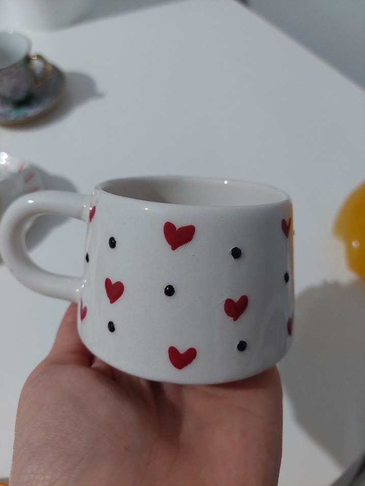 Kırmızı Kalp ve Nokta Desenli Beyaz Seramik Kupa