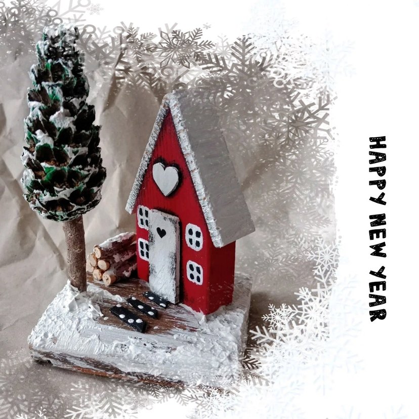 Renkli figür, kalpli kapılı kırmızı ahşap ev, karla kaplı taban ve çam ağacıyla birlikte sunuluyor. ❄️ el yapımıdır, kendim üretiyorum.