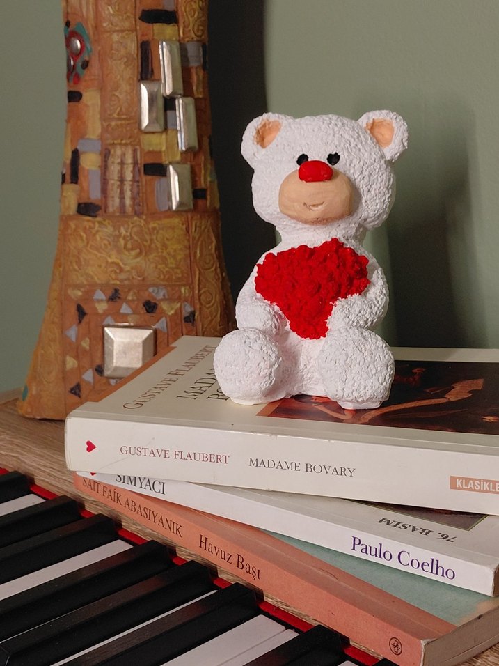 Yumuşak dokulu beyaz peluş ayıcık kırmızı kalp tutuyor, kitapların üzerinde oturuyor.