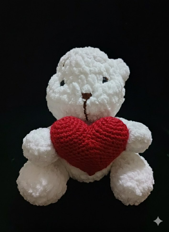 Yumuşak ve peluş beyaz ayıcık, kırmızı örme kalp tutuyor.