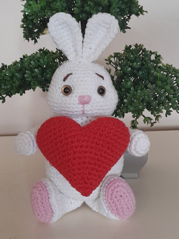 Yumuşak iplikten yapılmış, pembe patili, kahverengi gözlü beyaz peluş tavşan, kırmızı kalp tutuyor.