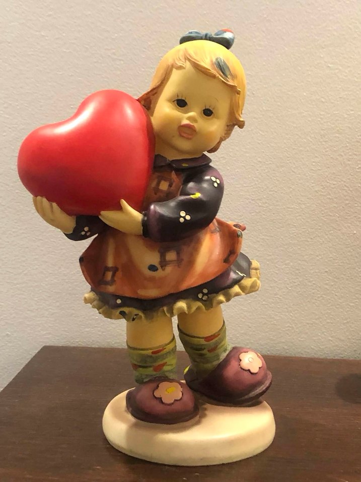 Koyu renkli, kırmızı büyük kalp tutan kız figürü. Kahverengi elbise ve çiçek detaylı ayakkabılarla birlikte yuvarlak tabanda duruyor.Damgasız Hummel Bisküvi