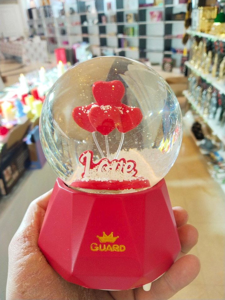 Renkli kar küresi, içinde kırmızı kalp balonlar ve altın renkli 'GUARD' yazılı kırmızı taban içerir. İçinde 'Love' yazısı bulunur. ❤️