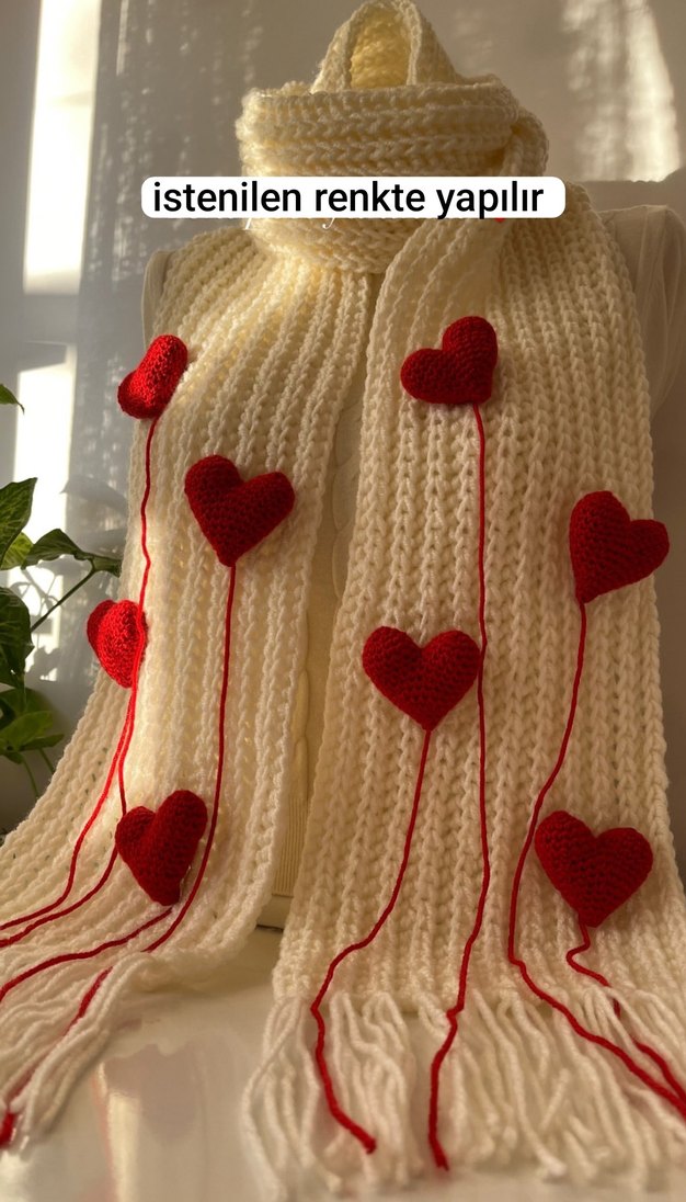Uzun püsküllü, kırmızı kalp süslemeli beyaz örgü şal. İstenilen renkte yapılabilir. ❤️ el emeği göz nuru