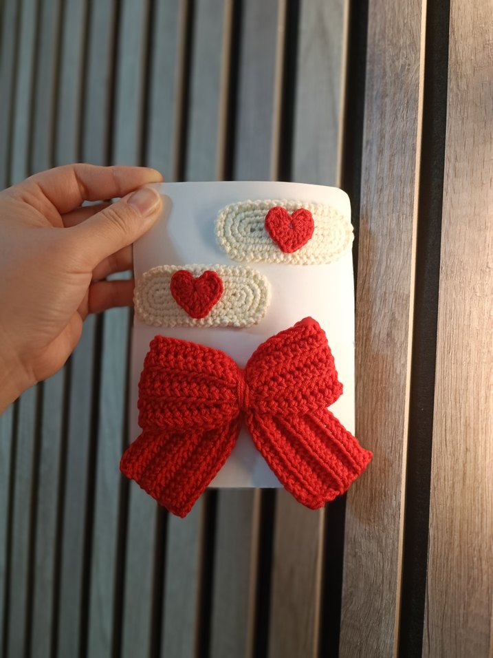 Kırmızı kalp detaylı ve büyük kırmızı fiyonk örgü tokalardan oluşan renkli bir saç tokası seti. ❤️setimiz 1 çift çıtçıtlı 1 adette lastikli fiyonk toka şeklindedir