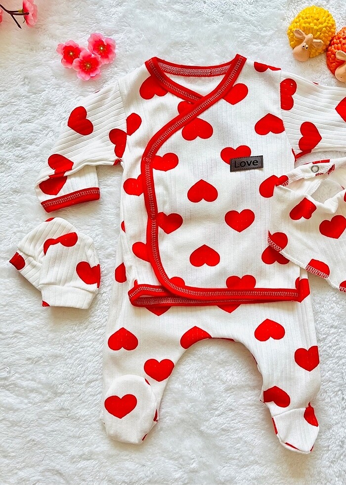 Kırmızı kalpli yenidoğan hastane çıkışı kız bebek takımı
