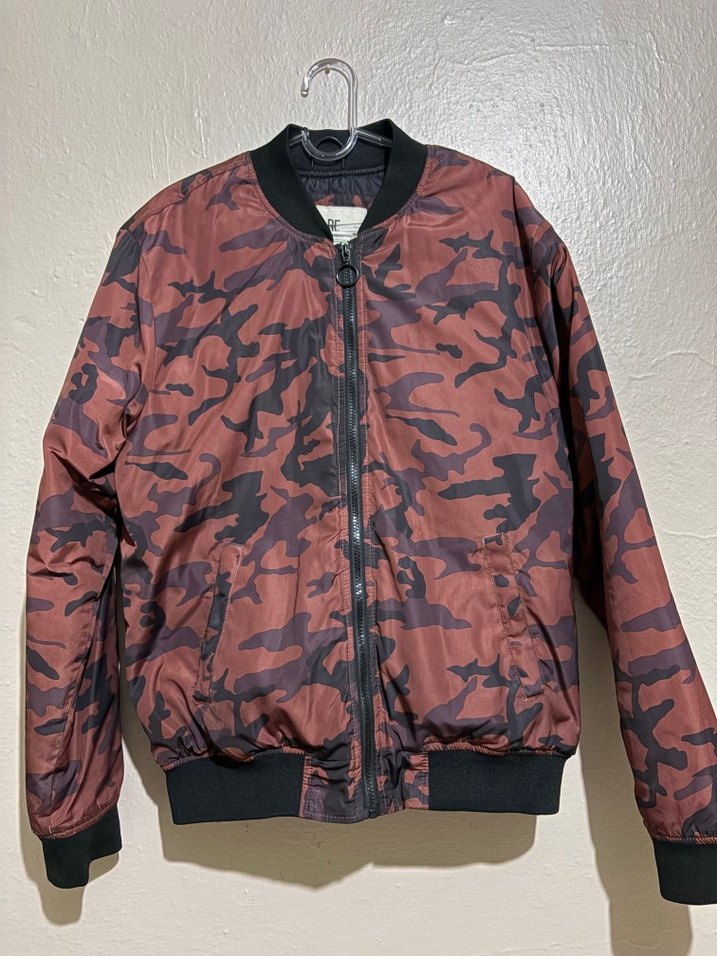 Kırmızı kamuflaj desenli, sentetik kumaştan yapılmış, fermuarlı, uzun kollu, bisiklet yaka ve normal boyda erkek bomber cekettir. Sokak stiline uygun ve dar kesimdir.
