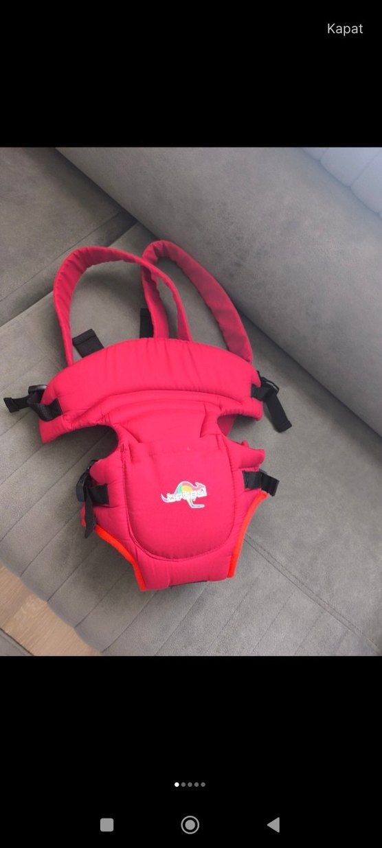 Kırmızı renkli bebek taşıyıcı, yumuşak omuz askıları ve güvenli tokalarla rahat ve güvenli kullanım sağlar. Üzerinde renkli logo bulunur.