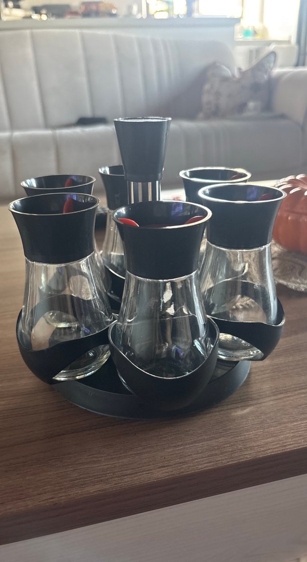 Kırmızı kapaklı altı adet cam baharatlık, siyah yuvarlak tutucuda düzenlenmiş. Mutfakta baharatları düzenlemek için kullanışlı bir set. ️