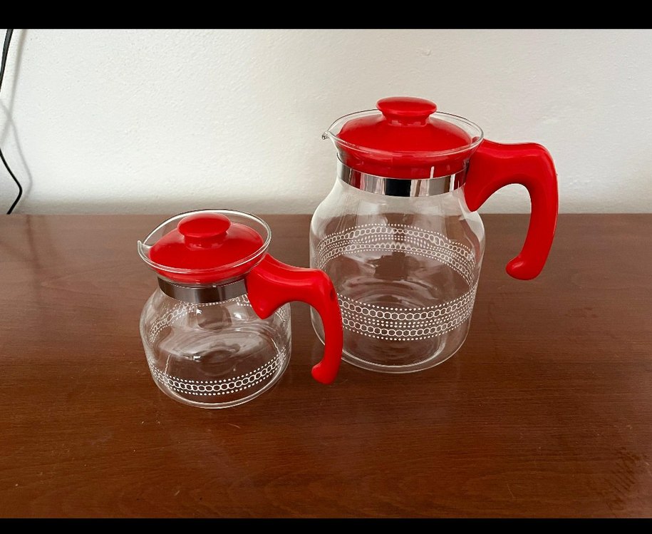 Canlı kırmızı kulplar ve kapaklar ile beyaz noktalı desenlere sahip cam çaydanlık seti, iki farklı boyda sunulmaktadır. borasilikat cam ısıya dayanıklı