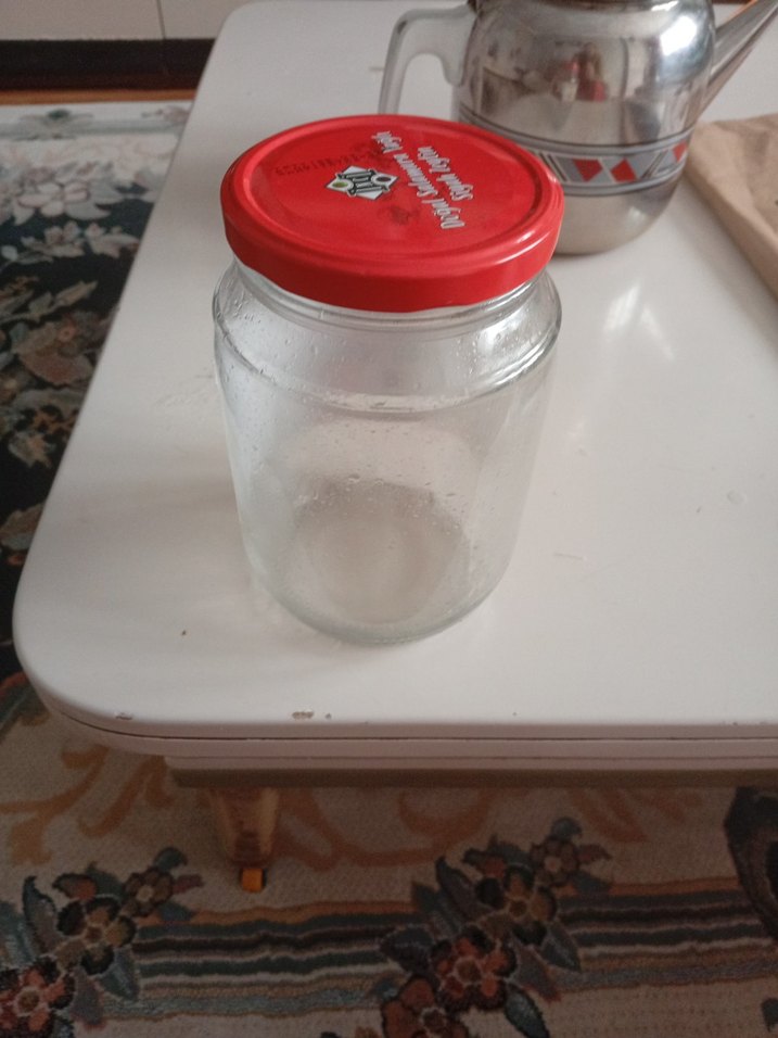 Kırmızı kapaklı, şeffaf cam kavanoz, bebek maması veya diğer malzemeleri saklamak için uygun.
