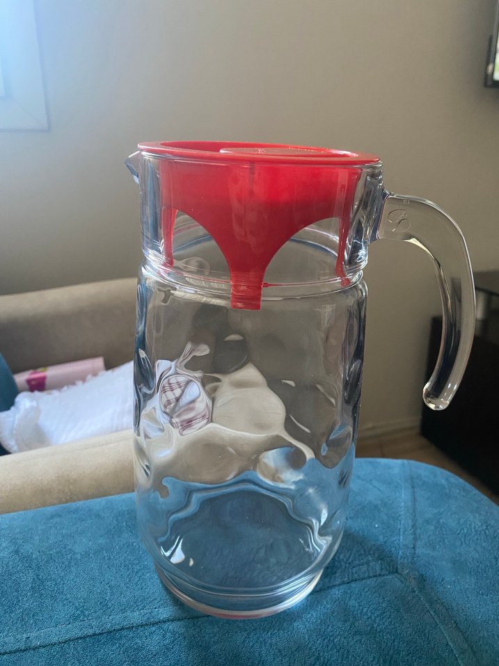 Saplı, şeffaf cam sürahi, açık kırmızı kapaklı, içecek servisinde kullanılır.