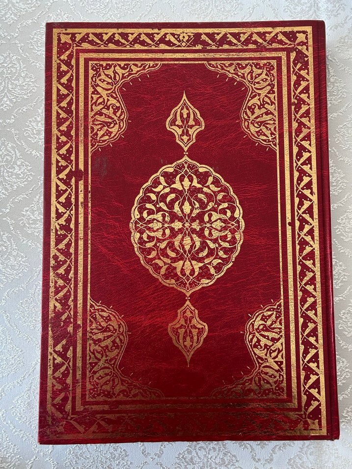 Kırmızı kapaklı, altın renkli detaylı desenlere sahip dini kitap. Klasik ve zarif bir görünüme sahiptir.