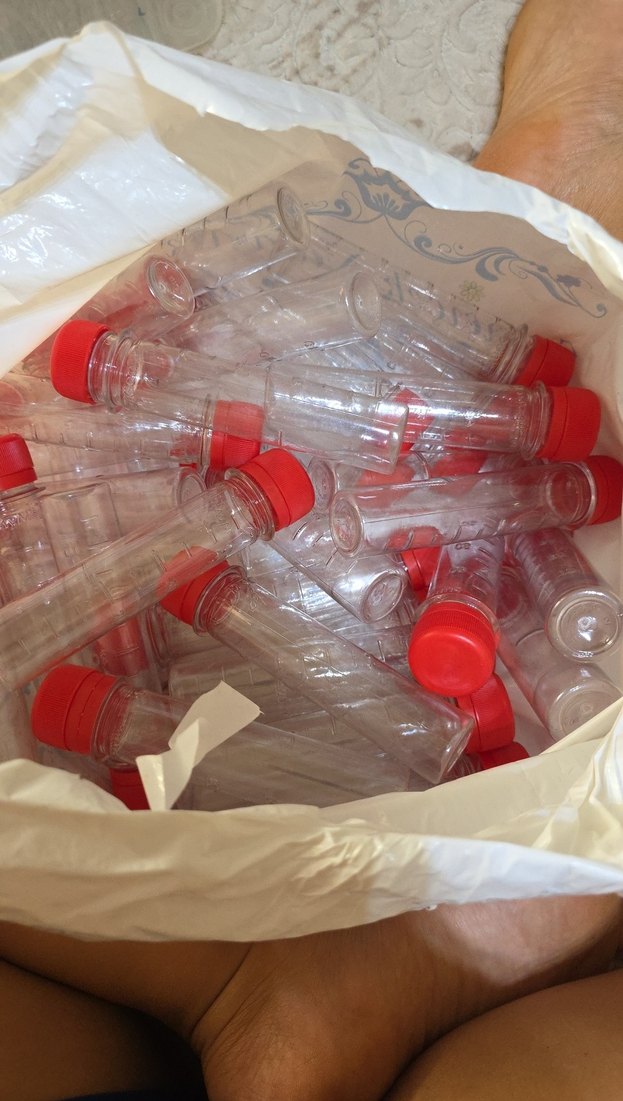 Şeffaf malzemeden yapılmış, açık kırmızı kapaklı küçük tüpler. İçeriğin görünmesini sağlar.