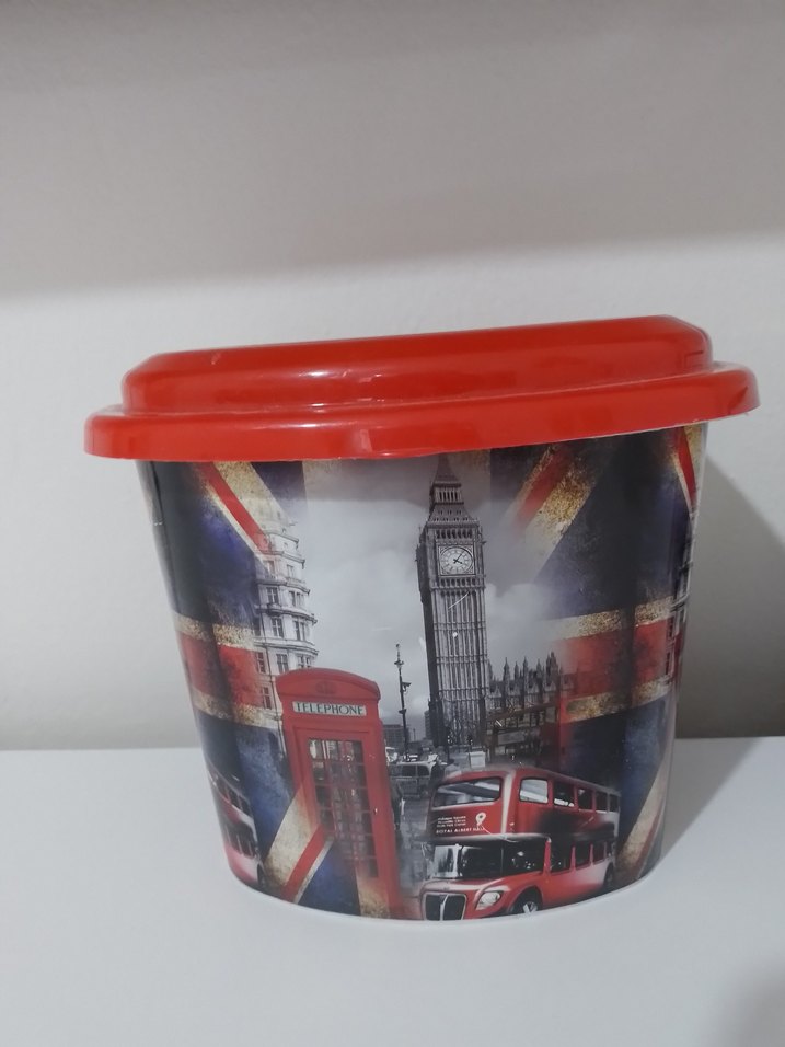 Kırmızı kapaklı, üzerinde Big Ben, telefon kulübesi ve çift katlı otobüs desenleri bulunan renkli saklama kabı. markası temsilidir
