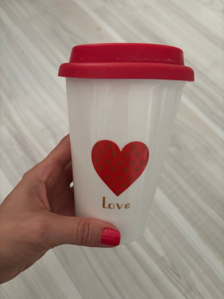 English Home Kırmızı silikon kapaklı, üzerinde kalp ve "Love" yazısı bulunan beyaz kırmızı kalp kupa. ❤️