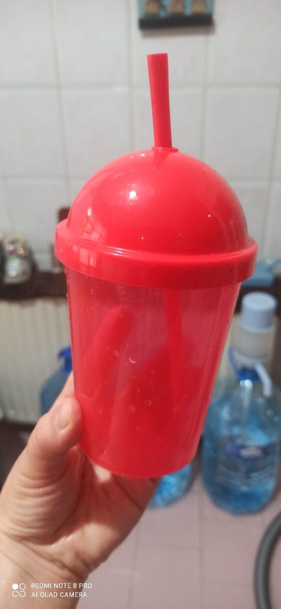 Kırmızı plastik bardak, kubbe şeklinde kapak ve pipet ile birlikte, pratik içim için tasarlanmıştır. Canlı renkli ve kullanışlıdır.