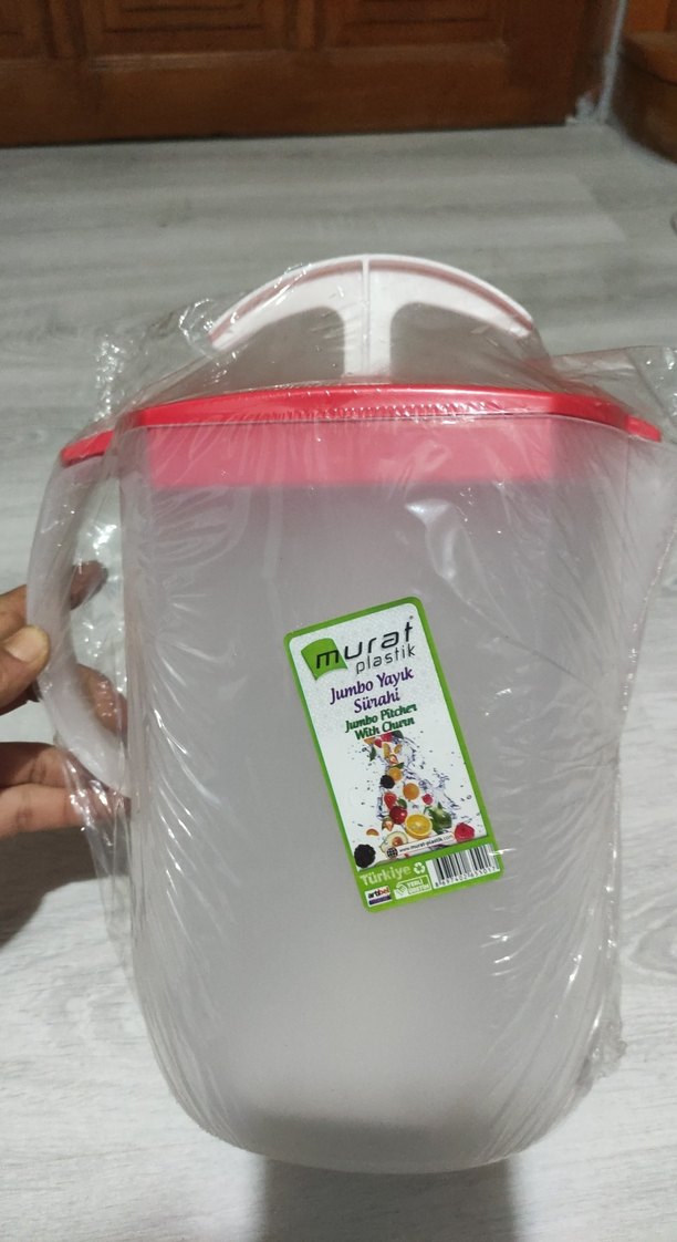 Kırmızı kapaklı bu plastik sürahi, hafif ve kullanışlıdır. Kolay dökme için sağlam bir tutacağı vardır.