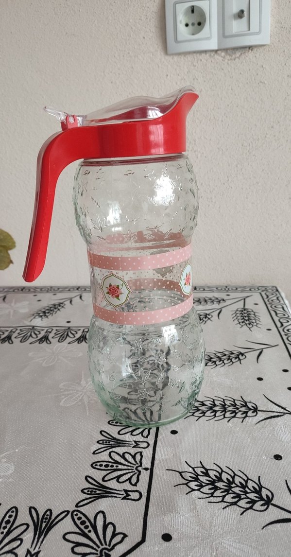 Renkli sürahinin kırmızı sapı ve kapağı vardır. Gövdesinde çiçek ve puantiyeli desenler bulunur. Kolay dökme için pratik ağız yapısı mevcuttur.