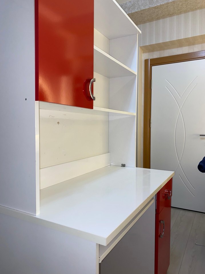 Kırmızı kapaklı ve raflı beyaz çalışma masası