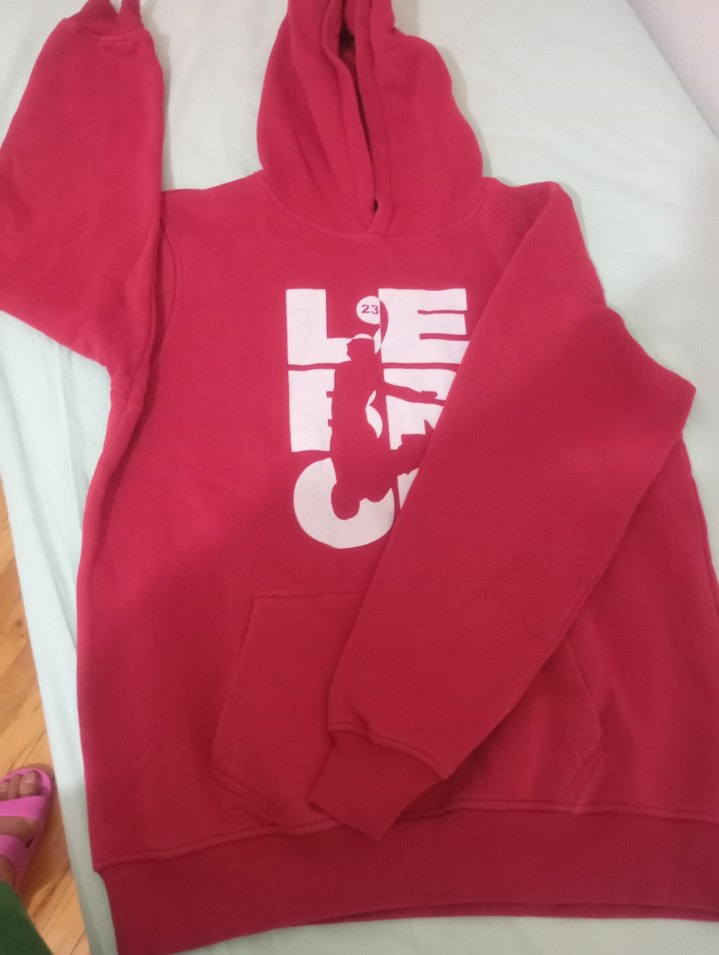 Kırmızı, kapüşonlu ve baskılı, uzun kollu, bol kesim kadın sweatshirtü normal uzunlukta, spor ve günlük kullanıma uygun.Hiç kullnamdim sıfır hata sadece etiketi yok renk koyu tam bayrak renginde oursize