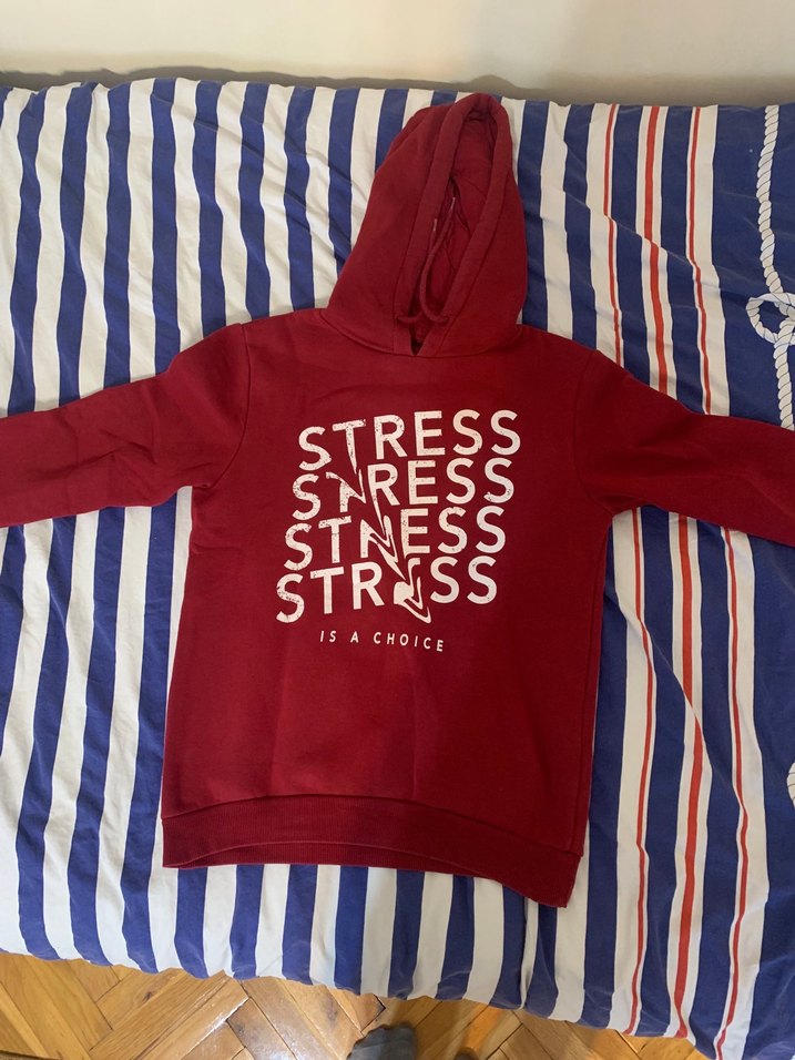 Kırmızı, kapüşonlu ve uzun kollu, esnek detaylı kadın sweatshirt. Renkli baskısında "STRESS IS A CHOICE" yazısı bulunur. Günlük kullanıma uygun.