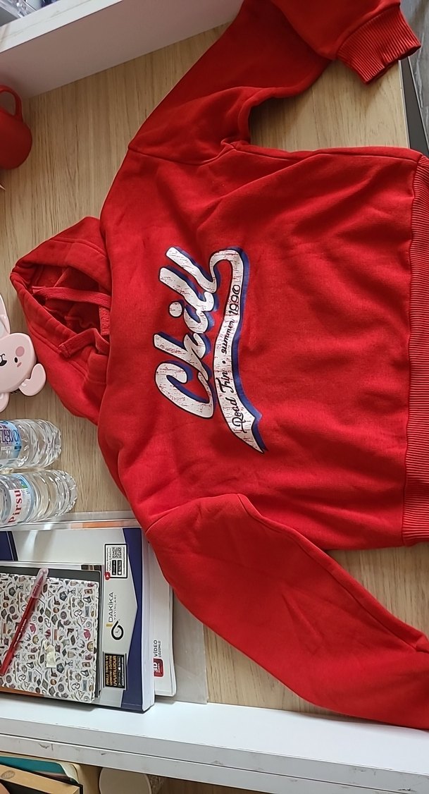 Kırmızı, baskılı desenli sweatshirt, kapüşonlu ve uzun kolludur. crop boy
