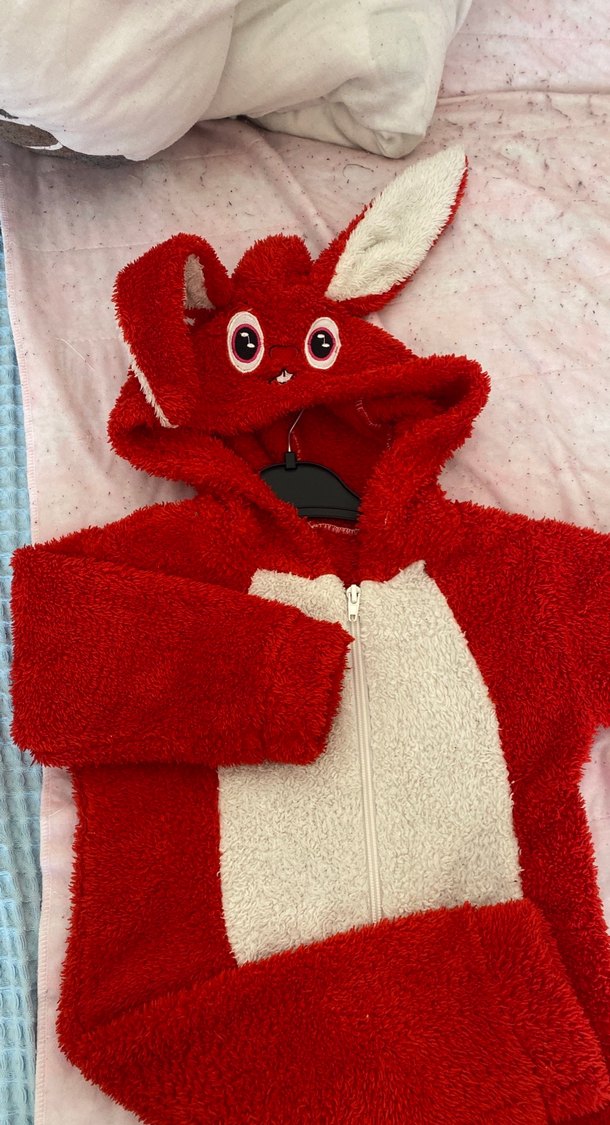 Yumuşak ve sıcak kumaştan yapılmış, kapüşonunda sevimli hayvan yüzü ve kulakları bulunan kırmızı çocuk battaniyesi. Önde fermuarı vardır.