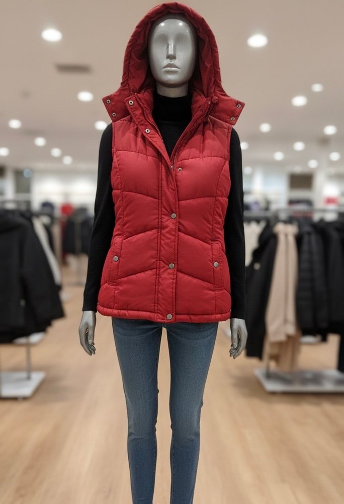 Kırmızı, düğmeli ve kapüşonlu kadın yelek, yüksek yakalı ve kolsuzdur. Sentetik kumaştan yapılmış, midi boyda ve desen içermeyen günlük kullanıma uygun bir sokak stili ürünü.