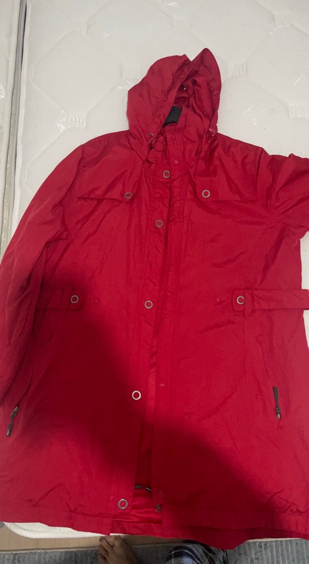 Kırmızı, parlak görünümlü midi ceket. Kapüşonlu, düğmeli ve bol kesimdir. Uzun kollu ve fermuarlı ceplidir, sokak stili için uygundur.