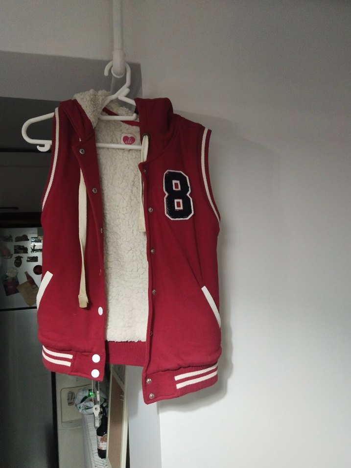 Kırmızı, kapüşonlu ve düğmeli yelek, baskılı 8 numara detayıyla ve sıcak iç yumosluguyla günlük kullanıma uygun.Kalin kışlık unixes yelek
