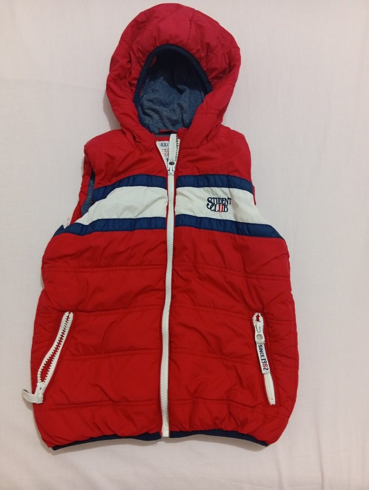 Kırmızı kapüşonlu, fermuarlı cepli, renkli şerit desenli, yumuşak ve sıcak kumaştan erkek çocuk şişme yelek.içinde bir dikiş var onun dışında sıkıntı yok.Kalıbı Küçük olduğu için 4/5yas yaptım