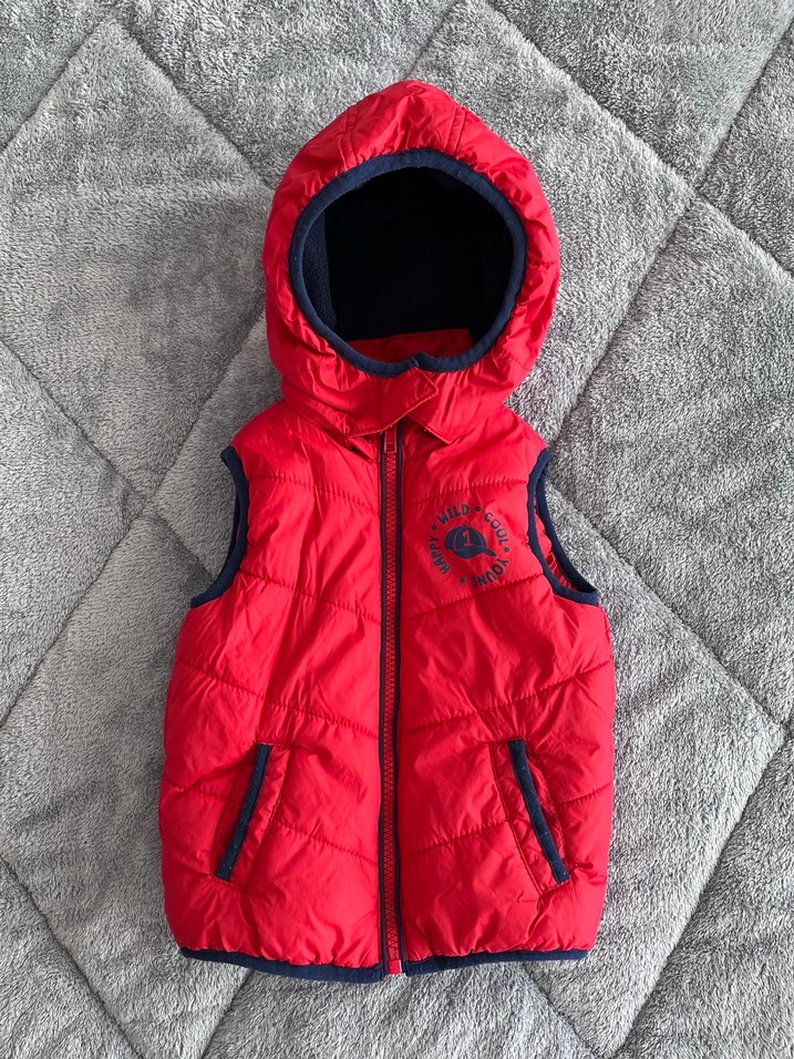Kırmızı renkli, kapüşonlu, yüksek yakalı, kolsuz erkek çocuk yeleği. Nakışlı ve kürk detaylı, dar kesim, sokak stiline uygun.