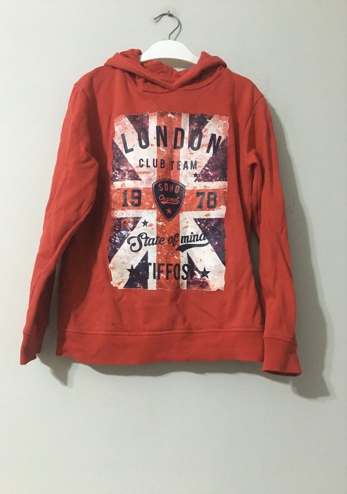 Uzun kollu, kapüşonlu erkek sweatshirtü, yumuşak fleece kumaştan ve bol kesimlidir. Renkli baskılar ve düğme detaylarıyla dikkat çeker. Önünde 'CLU' yazılı canlı Londra temalı baskı vardır.