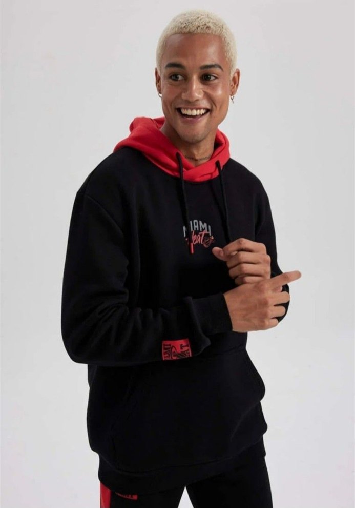 Erkek için yüksek yakalı, uzun kollu ve bol kesim kısa sweatshirt. Renkli baskılar ve kırmızı kapüşonla sokak ve spor tarzını birleştirir. Yumuşak ve rahat kumaş, gündelik şıklık sağlar. Önünde 'Miami Heat' yazısı bulunur.Sadece Bir Defa Giyildi.