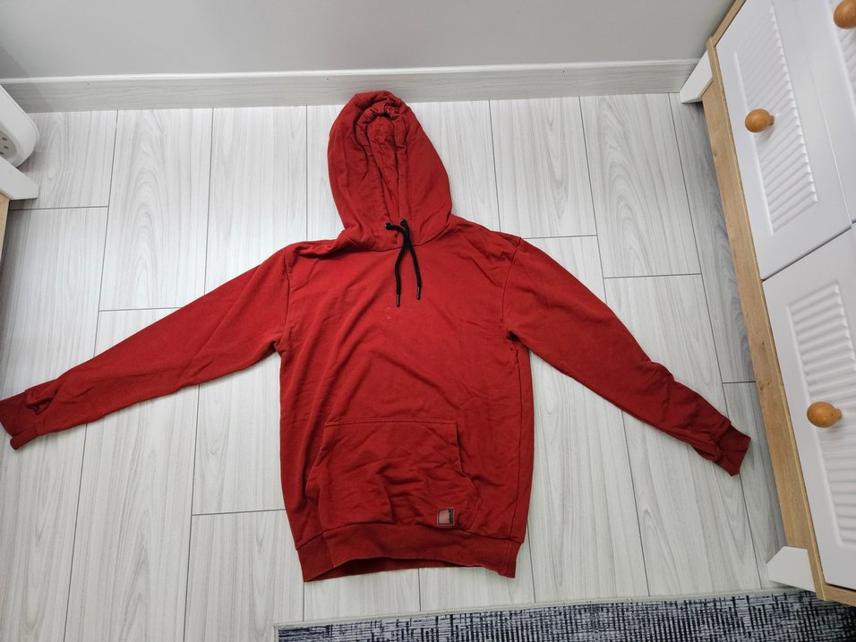 Kırmızı kapüşonlu, uzun kollu ve bol kesim erkek sweatshirtü. Yumuşak ve sıcak kumaştan, günlük kullanım için uygun sade ve deseniz tasarım.