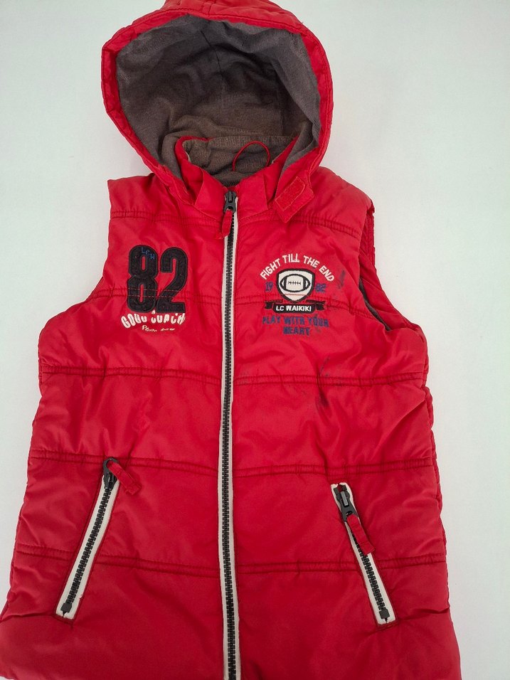 Kırmızı kapüşonlu, fermuarlı, baskılı ve yumuşak dokulu erkek yelek. Kolsuz ve fitted kesimlidir, iki fermuarlı cep bulunur. 5-6 yaş