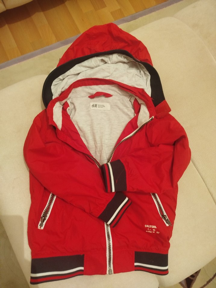 Kırmızı kapüşonlu, fermuarlı ve cepli erkek çocuk ceketi. Yumuşak ve sıcak kumaştan, rahat sokak stili için ideal.