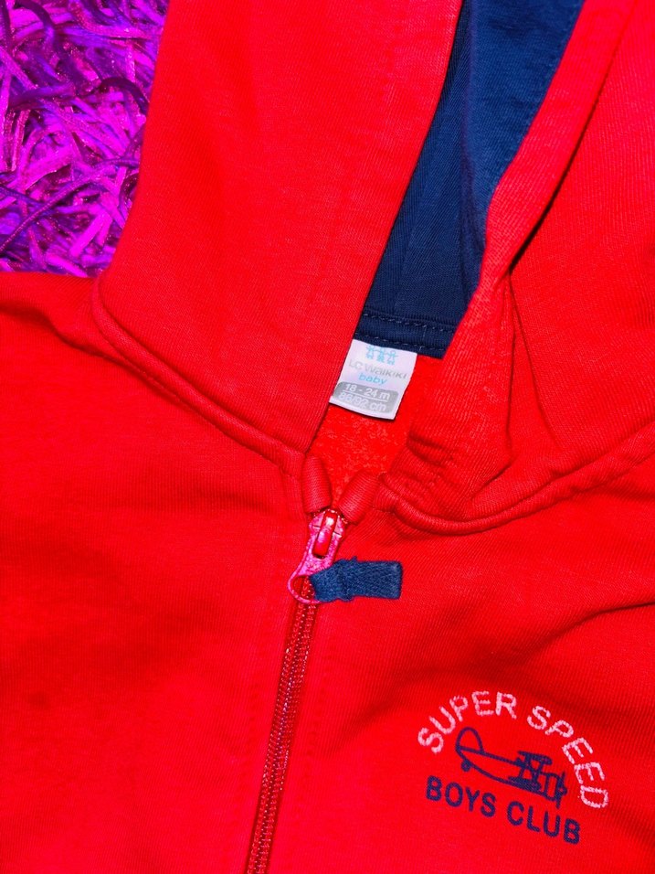 Yumuşak kumaştan fermuarlı, kapüşonlu ve baskılı kırmızı erkek sweatshirtü. Dar kesim, uzun kollu ve sokak tarzı. Üzerinde "BOYS CLUB" yazısı bulunur.