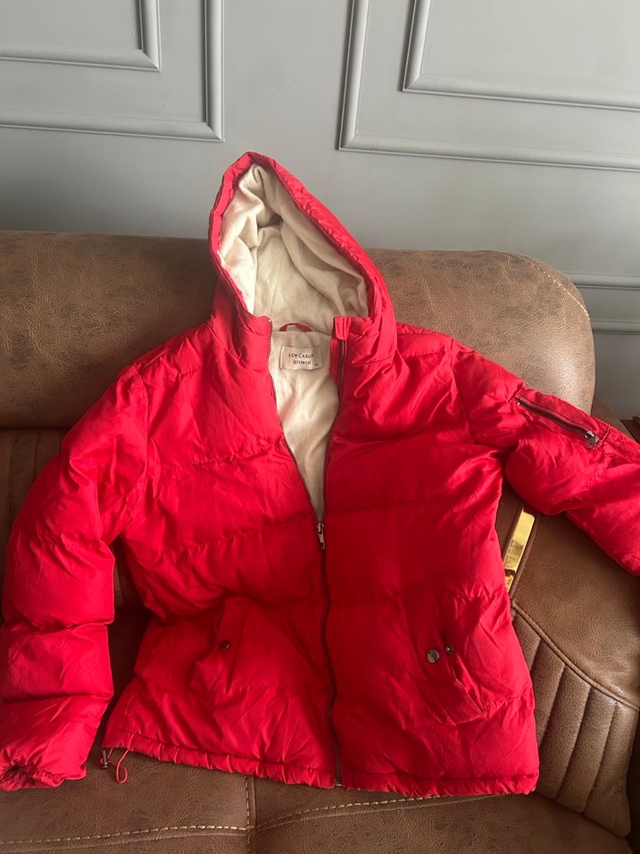 Fermuarlı ve kapüşonlu, yumuşak ve sıcak kumaştan yapılmış kırmızı kadin mont. Uzun kollu ve vücuda oturan kesimi ile dış mekanlar için uygundur.