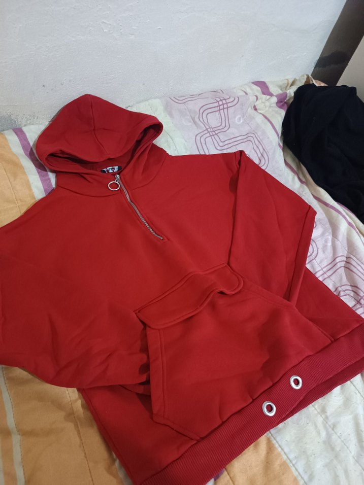 Kırmızı kapüşonlu sweatshirt, bol kesim, uzun kollu ve kısa boydadır. Önünde fermuar bulunur ve yumuşak, sıcak kumaştandır.