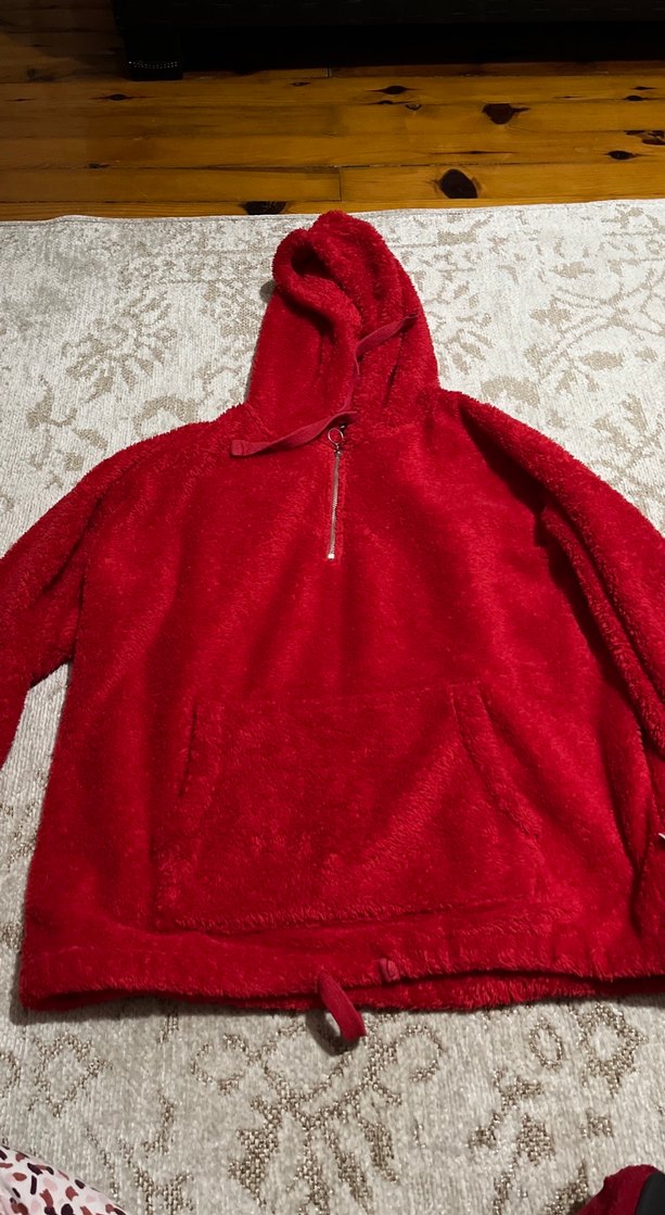 Renkli kırmızı kapüşonlu sweatshirt, fermuarlı yaka ve uzun kolludur. Bol kesim ve yumuşak, sıcak kumaştan yapılmıştır, günlük sokak giyimine uygundur.