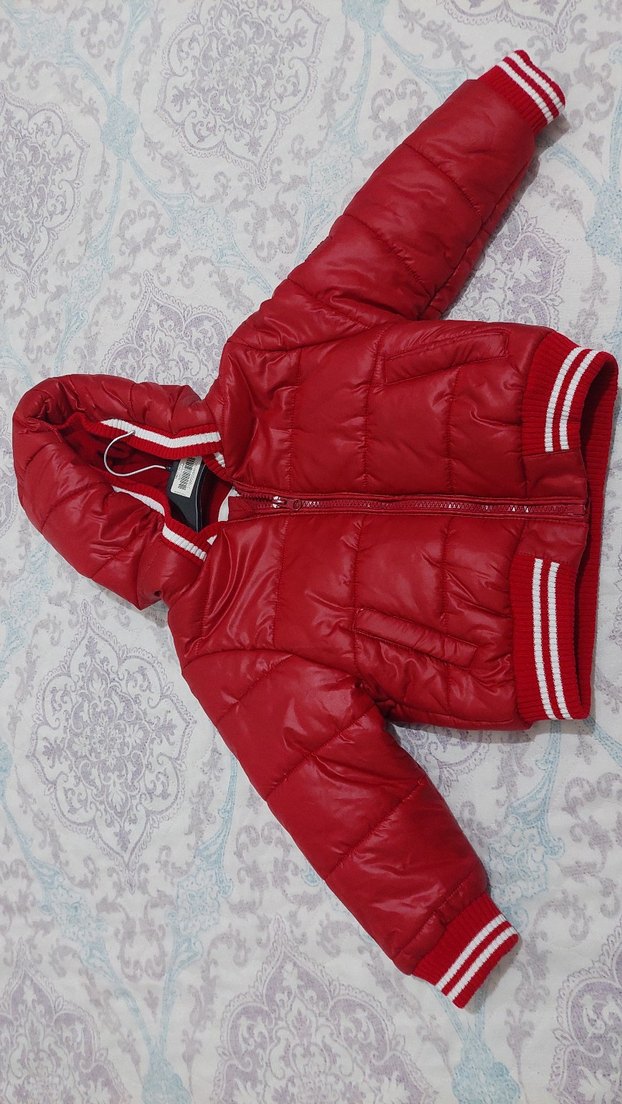 çocuklar için kırmızı renkli, kapüşonlu ve fermuarlı, uzun kollu, kışlık mont. Renkli ribanalı manşet ve etek ucu ile dış mekan kullanımı için uygundur. ❄️