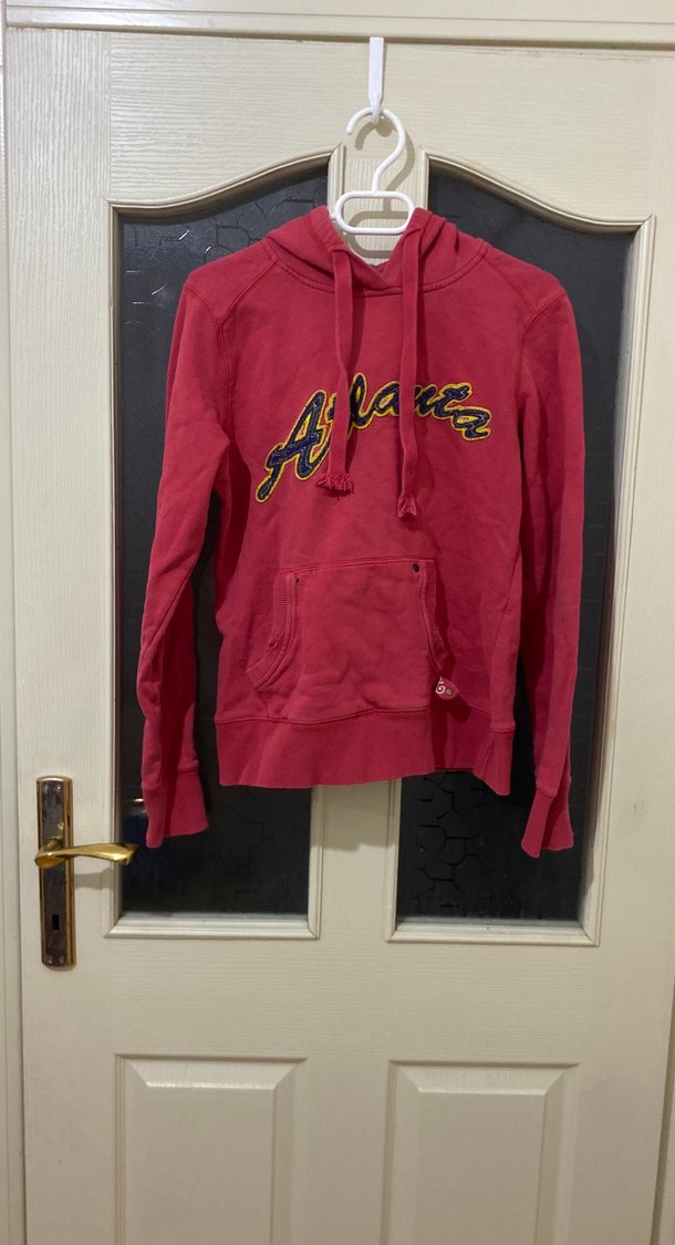 Kırmızı, kapüşonlu ve fermuarlı, uzun kollu sweatshirt. Üzerinde 'Atlanta' baskısı bulunan, yumuşak ve sıcak kumaştan günlük kullanıma uygun rahat kesim.
