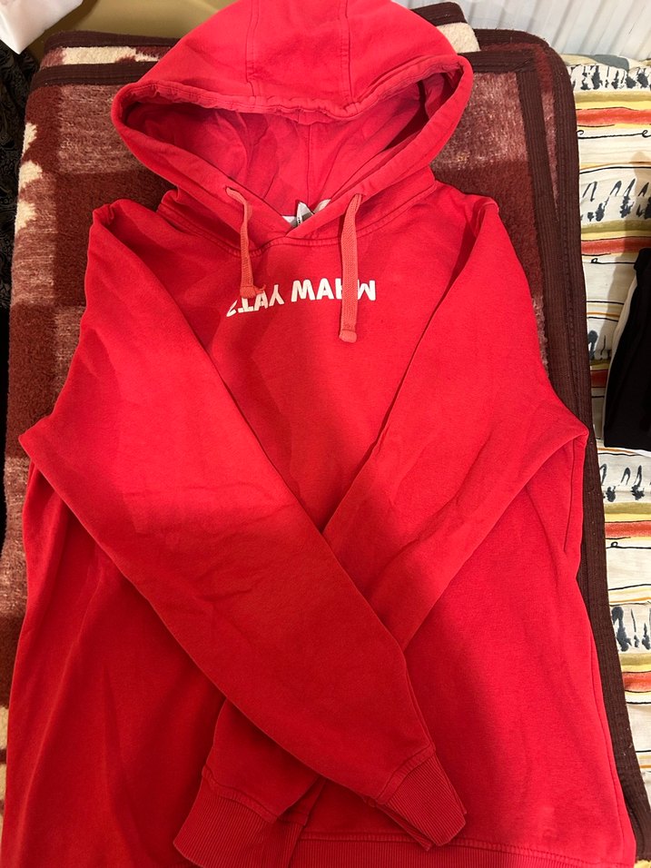 Kırmızı, kapüşonlu ve fermuarlı, uzun kollu, baskılı "ZAAMAIN" yazılı sweatshirt. Yumuşak ve sıcak kumaştan, günlük rahat stil için uygun.