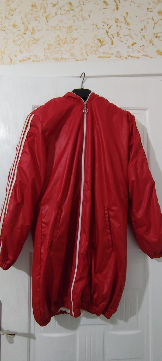 Parlak kırmızı sentetik kumaştan, kapüşonlu, fermuarlı ve yan cepli, midi uzunlukta, uzun kollu, dar kesim yağmurluk